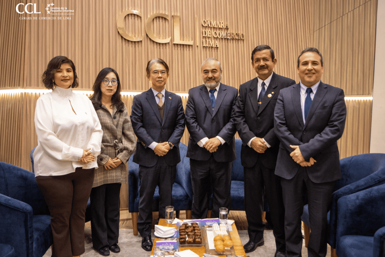 Directora del Gremio de la Pequeña Empresa, Diana García; Primera Secretaria - Embajada de Corea, Lee Sorie; Embajador de Corea en Perú, Jong Uk Choiu; Presidente del Gremio de la Pequeña Empresa de la CCL, Rodolfo Ojeda; Vicepresidente del Gremio de la Pequeña Empresa de la CCL, Lizandro Mejía y Director del Gremio de la Pequeña Empresa de la CCL, Luis Goytizolo